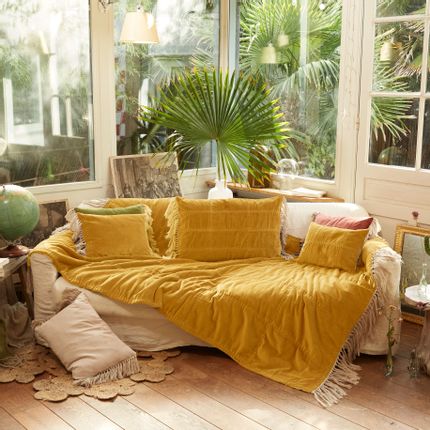 A cotton velour plaid, hand-stitched, with a natural cotton veil backing. A big bohemian plus: delicate natural linen fringes on the short sides. Emma Bovary or La Dame aux Camélias are not far away. We would like to take it everywhere, from his romantic bedroom to his opera room. Eternal crush. Boho is available in 30x45cm, 35x50cm cushions, 50x75cm pillowcases, 140x250cm throws, 240x250cm bedspreads, 140x300cm curtains and bags.