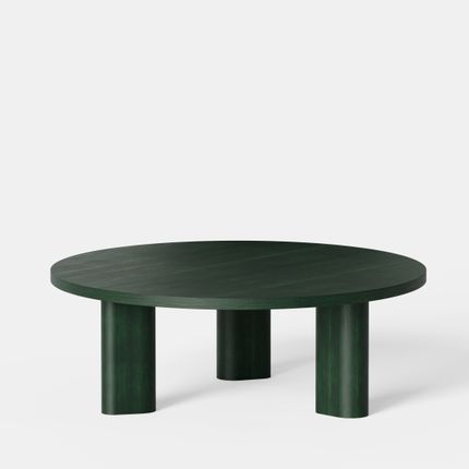 The round coffee table from the Galta collection plays on the principle of accentuating formats. The proportions of the base are generous, enlarging the teardrop shape typical of the Galta collection. Also, with the idea of emphasis, the arrangement of the three legs favors the shift.