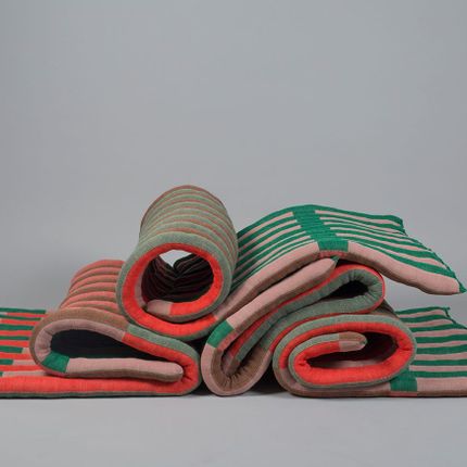 Knotting Knitting was designed from solid bands, all knitted. The set forms a rhythmic combination of colors and irregular lines, which can serve several purposes: sitting, sleeping, reading, lying down, or even bundling up. It was created to actively adapt to the body while providing comfort and warmth. Pillow/plaid/ottoman Designed by Ana María Gómez