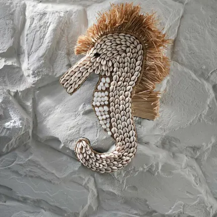 This decorative sea horse is made completely out of beautiful white shells, finished off with raffia fringes. This is a fun and beautifully made accessory that you can hang in any place you fancy. It will certainly be the topic of talk!
