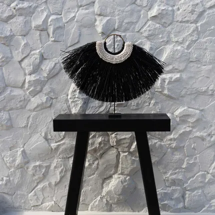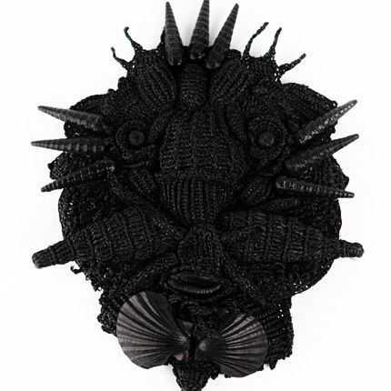 Raffia mask with shells covered in recycled leather. Natalia Brilli collects objects (talismans or fetishes) and then works on the pieces to cover them with leather. All leathers come from dormant stocks in French and Italian luxury tanneries, which is why most creations are limited and numbered editions.