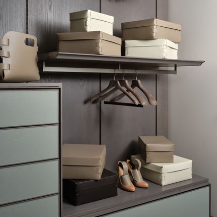 Elegant boxes, specifically designed to fit seamlessly into standard-size closets. These versatile storage solutions are perfect for organizing a variety of items, including footwear, clothing, sport equipment and more. It has high wear resistance to abrasion and scratches, which is extremely important for daily use. Water and dirt-repellent properties make it easy to clean the surface and to get rid of stains. Customizable sizes. S 25x15xH13.5; M 32x20xH13.5; L 36x30xH13.5.
