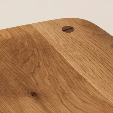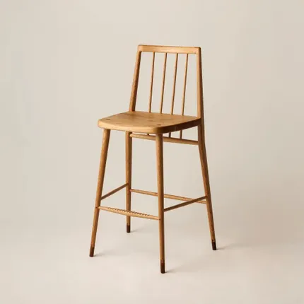 With its softly rounded form and through-seat back spokes, this high chair blends elegance with craftsmanship. The walnut-tipped legs are joined with cross tenons, highlighting fine joinery.