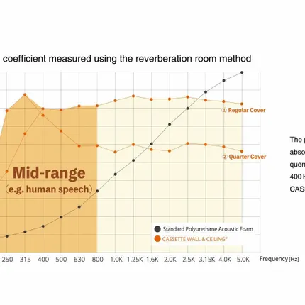 CASSETTE WALL & CEILING® consists of a panel, base, and cover, which create a three-layer sound-absorbing space. The space provides high sound absorption in various frequency bands.