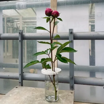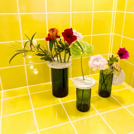 Un vase deux-en-un qui se décline un pique-fleur ou vase, permettant de jouer avec une fleur ou un bouquet. Pique fleur en plastique recyclé Ses deux formats : petit et grand correspondent respectivement à une bouteille de 75cl et Magnum, upcyclée. Design by Laurence Saugé.
