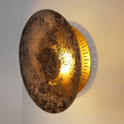 Applique Sole support de finition : fermeture en laiton et disque doré feuille d'or. Finition en verre miroir : transparent, fumé, cuivre, or, argent ou moucheté. La gamme illumine les intérieurs grâce à un halo doré. Diamètre du verre 450 mm. LED 17 Watts dimmable, 1700 lumens. Contemporain et décoratif, l'applique Sole est parfait pour une ambiance unique.